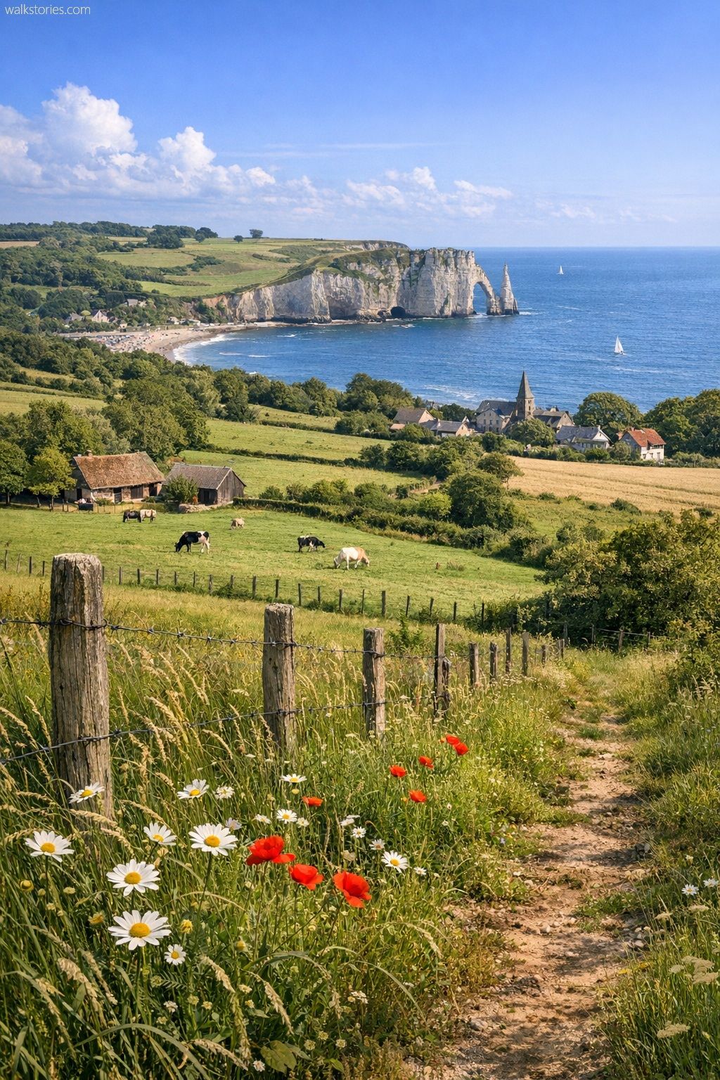 ↬ Campagne normande, près du littoral et vue sur la falaise d'Aval