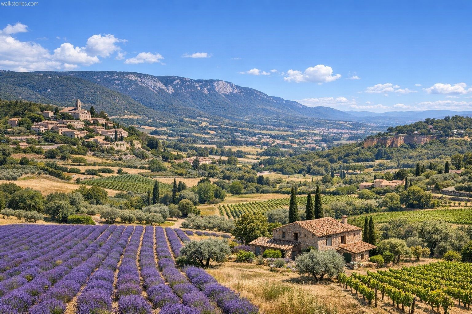 ↬ Paysage provençal typique agrémenté d'oliveraies, de champs de lavande et de mas éparpillés