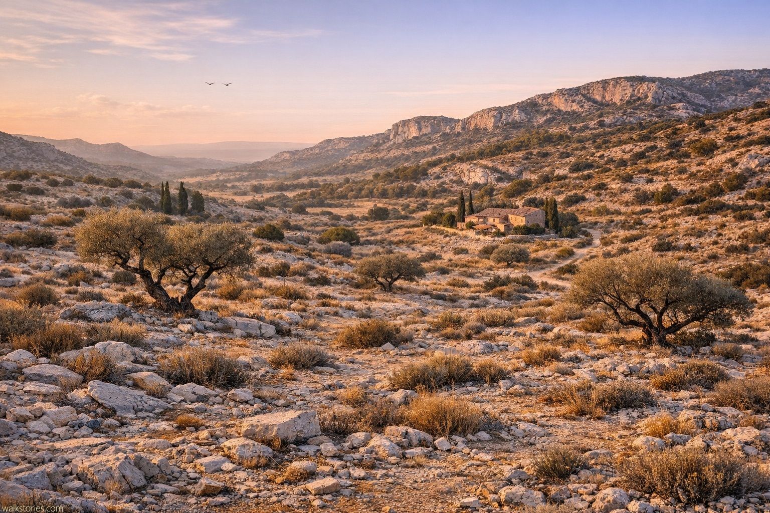 ↬ Garrigue provençale à l'aube, dans une vision sèche et minérale — lumière dorée rasante, sol pierreux, végétation rare et silhouettes d'oliviers noueux