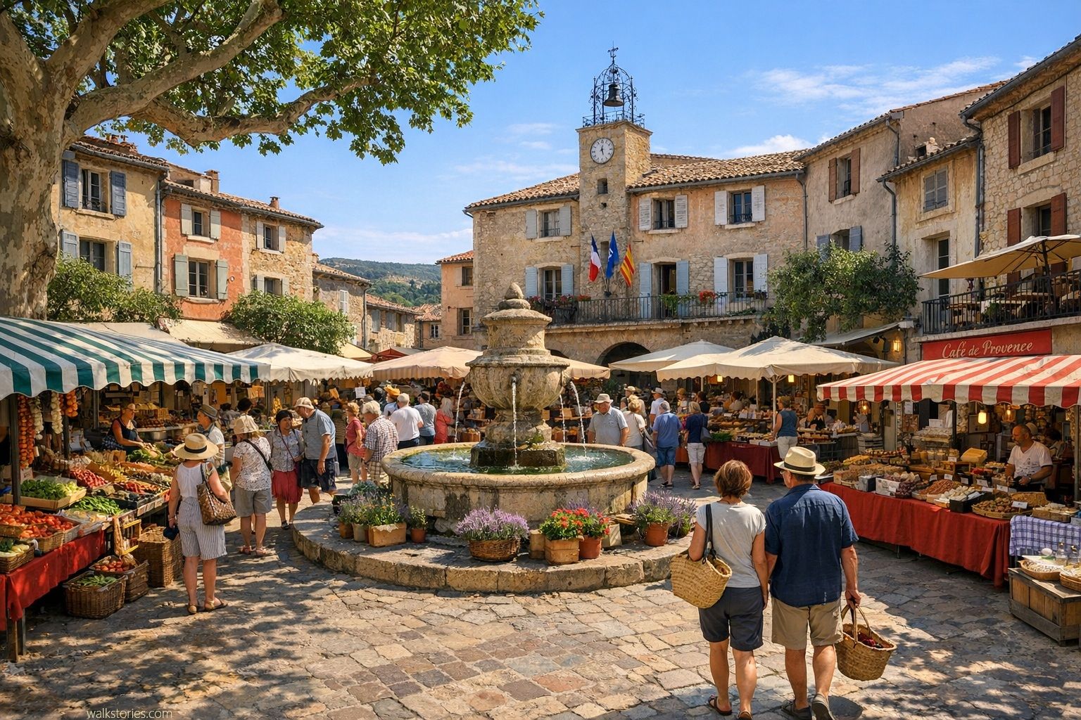 ↬ La place du village provençal s'étend sous un ciel limpide, dominée par son clocher de pierre et sa fontaine centrale. Les façades dorées, les terrasses de café et les pots de fleurs créent une atmosphère vivante et authentique